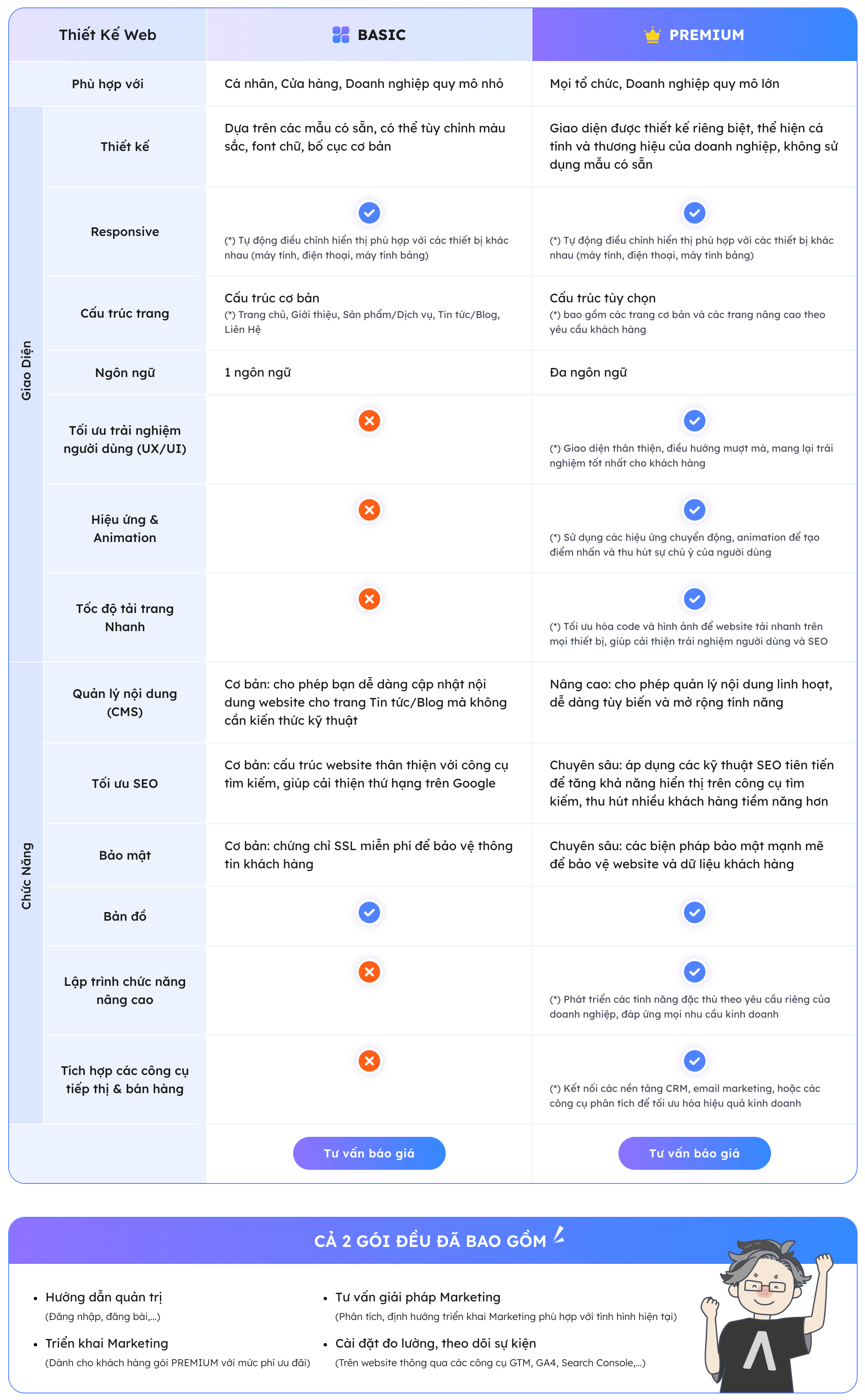 “Giá thiết kế website là bao nhiêu?” là câu hỏi chúng tôi thường xuyên nhận được. Để giúp bạn có cái nhìn rõ ràng, chúng tôi cung cấp bảng giá thiết kế website chi tiết. Vui lòng liên hệ trực tiếp để nhận báo giá thiết kế website chính xác nhất, được tùy chỉnh theo đúng nhu cầu của bạn. Chúng tôi cam kết mức giá luôn đi đôi với chất lượng.