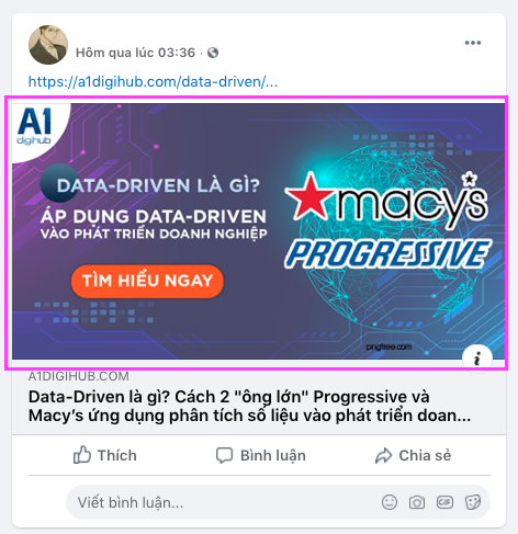Trên Facebook eyecatch sẽ hiện như hình trên. Kích thước hình sau khi chia sẻ lên Facebook to nhất sẽ là width 628×height 628px.